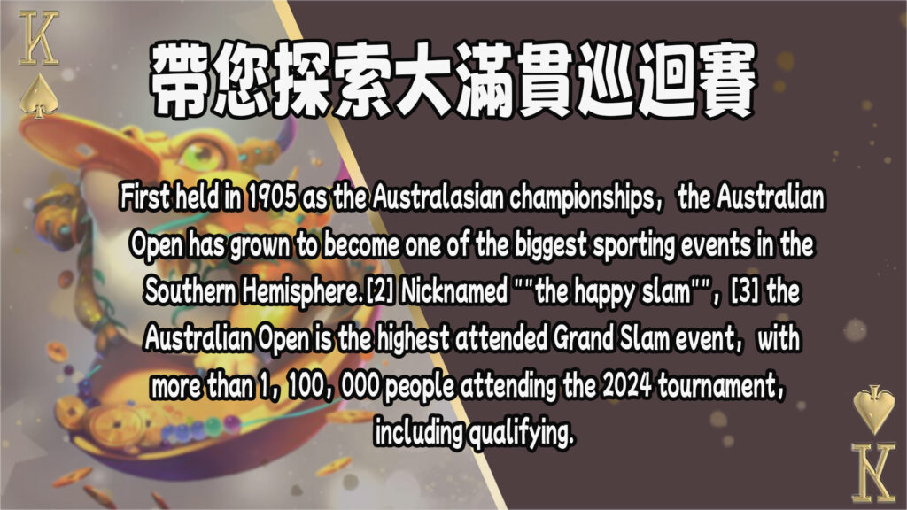 First held in 1905 as the Australasian championships, the Australian Open has grown to become one of the biggest sporting events in the Southern Hemisphere.[2] Nicknamed “the happy slam”,[3] the Australian Open is the highest attended Grand Slam event, with more than 1,100,000 people attending the 2024 tournament, including qualifying. It was also the first Grand Slam tournament to feature indoor play during wet weather or extreme heat with its three primary courts, Rod Laver Arena, John Cain Arena and the refurbished Margaret Court Arena equipped with retractable roofs. (引文)