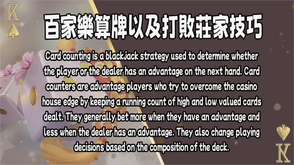 算牌是一種策略,涉及追蹤已打出的牌以預測下一張可能出現的牌。 這是一種非常流行的技術,尤其是在二十一點等撲克遊戲中。 但您也可以在百家樂中使用它。 基本上,算牌的目的是幫助您了解出現了哪些牌,並從中得出下一張牌的機率。